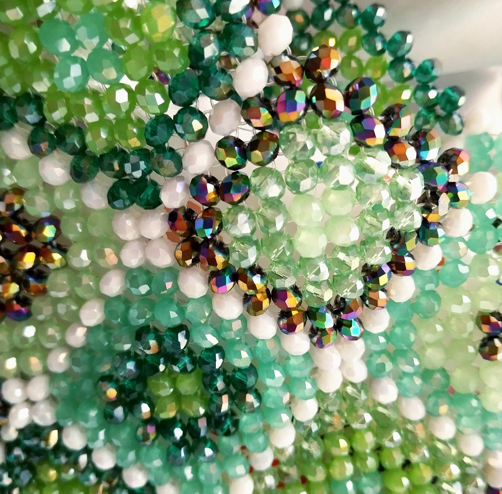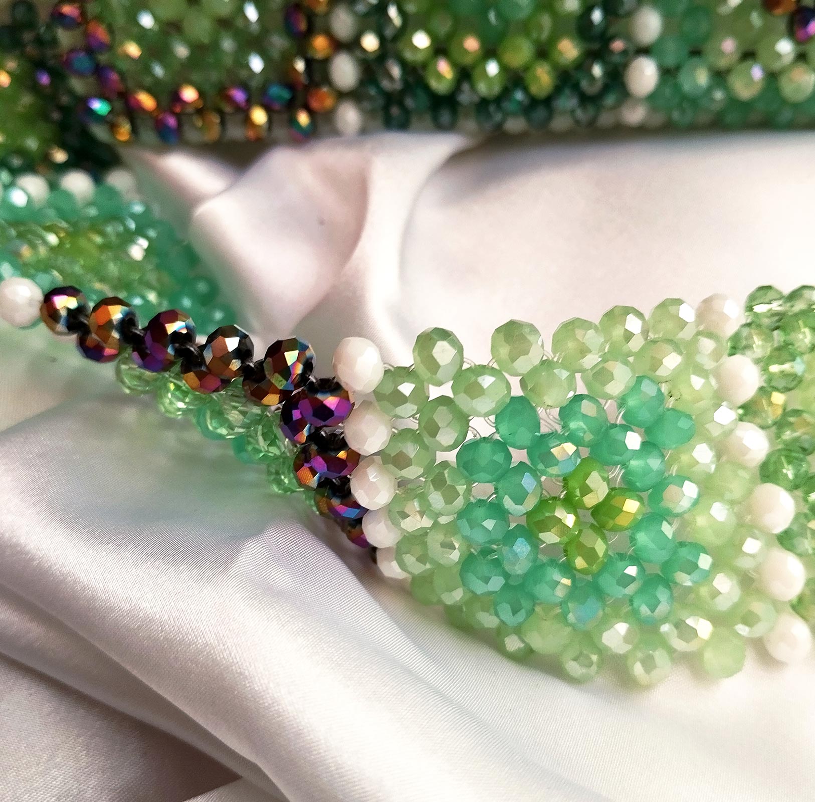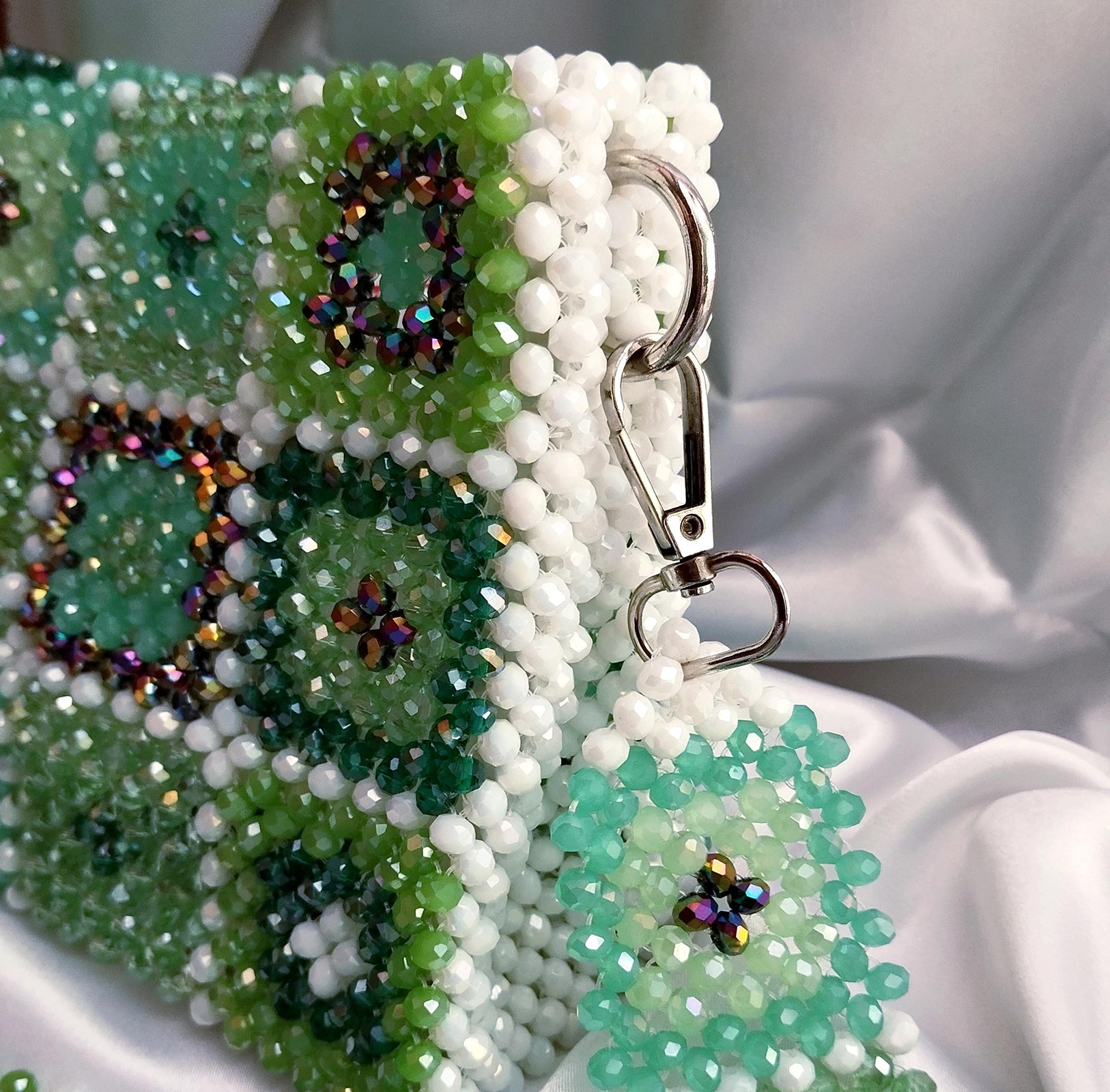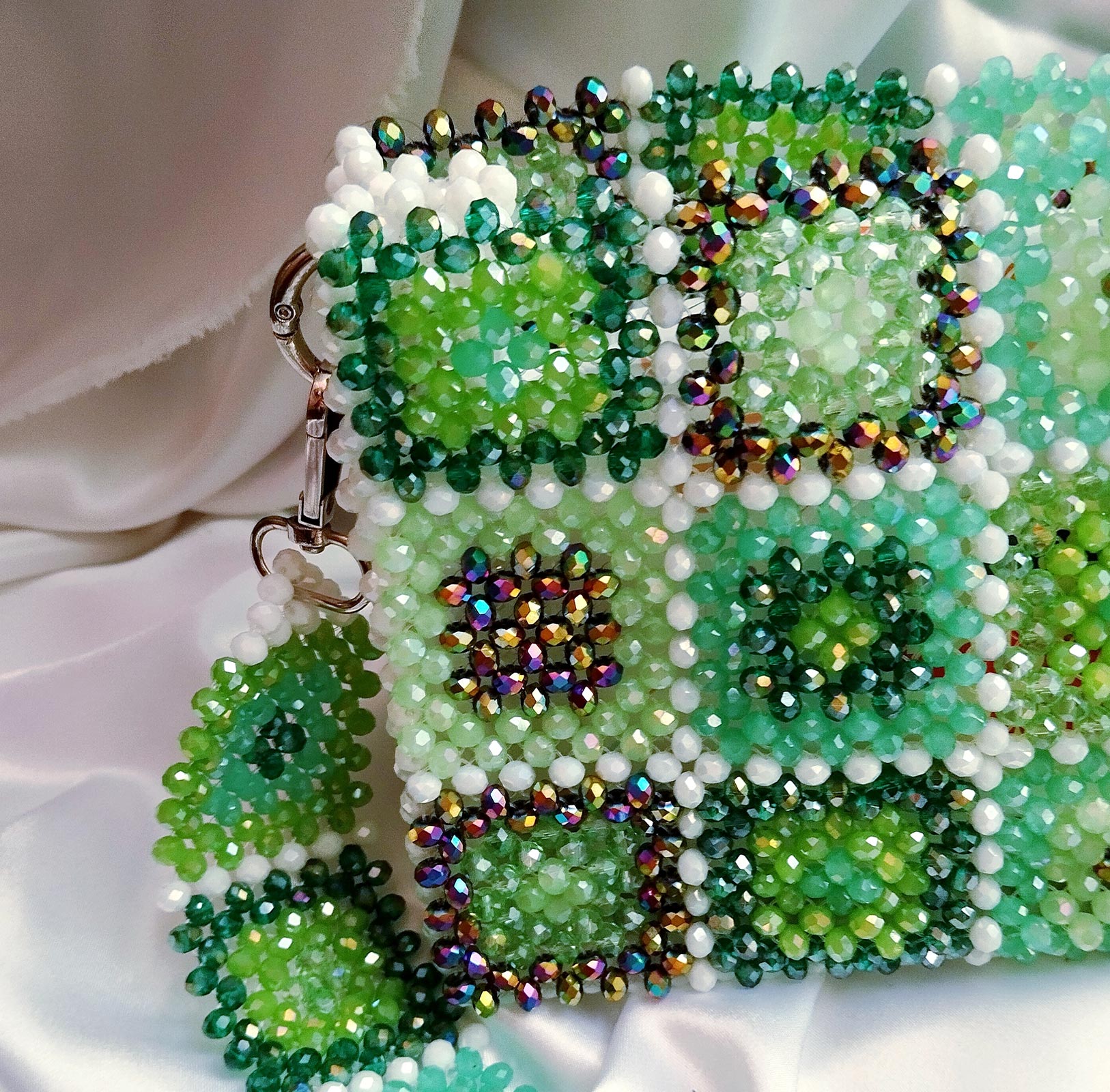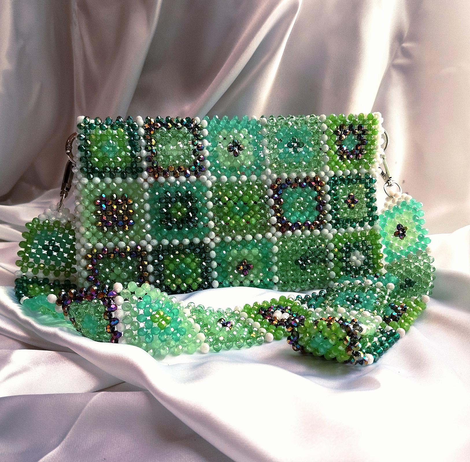 Make a bold statement with Emerald Green, a meticulously handcrafted beaded bag that blends timeless craftsmanship with contemporary artistry. Designed in a striking mosaic of vibrant green tones, this piece features intricately arranged crystal and pearl-like beads that create a captivating, geometric patchwork effect. Each bead is thoughtfully selected and handwoven to form a tactile, dimensional surface that reflects light beautifully from every angle.