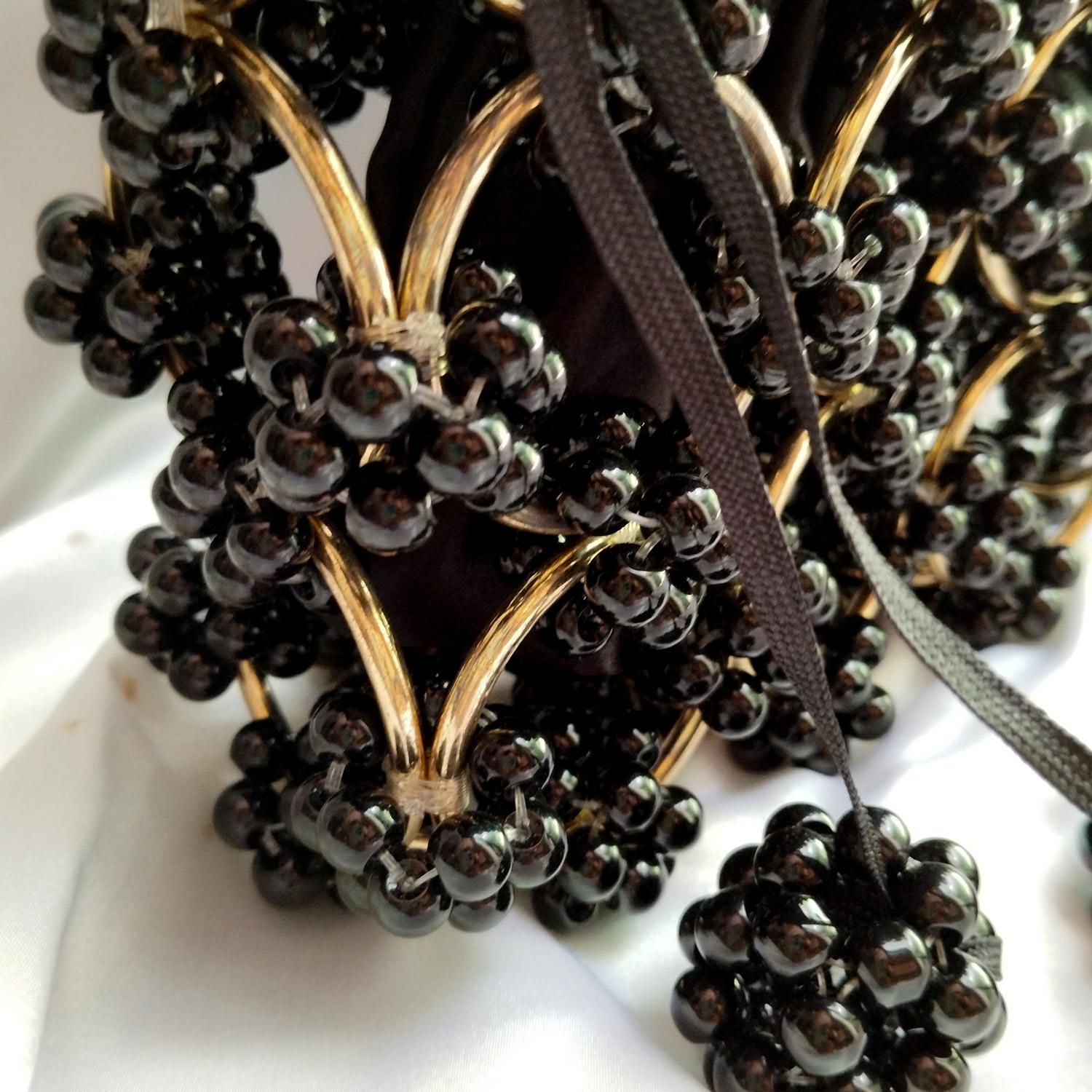 Where classic craftsmanship meets modern opulence—introducing the Nocturne Ring Beaded Handbag. Designed to captivate, this structured statement piece features an intricate arrangement of glossy black beads interwoven with polished gold-tone rings, forming a bold yet elegant silhouette. The inner satin drawstring pouch adds softness and functionality, making this bag as practical as it is artistic.